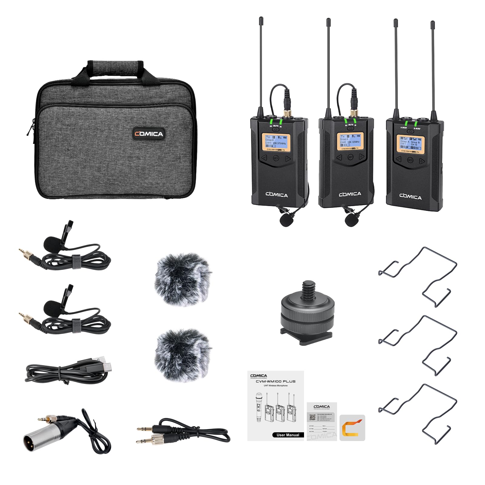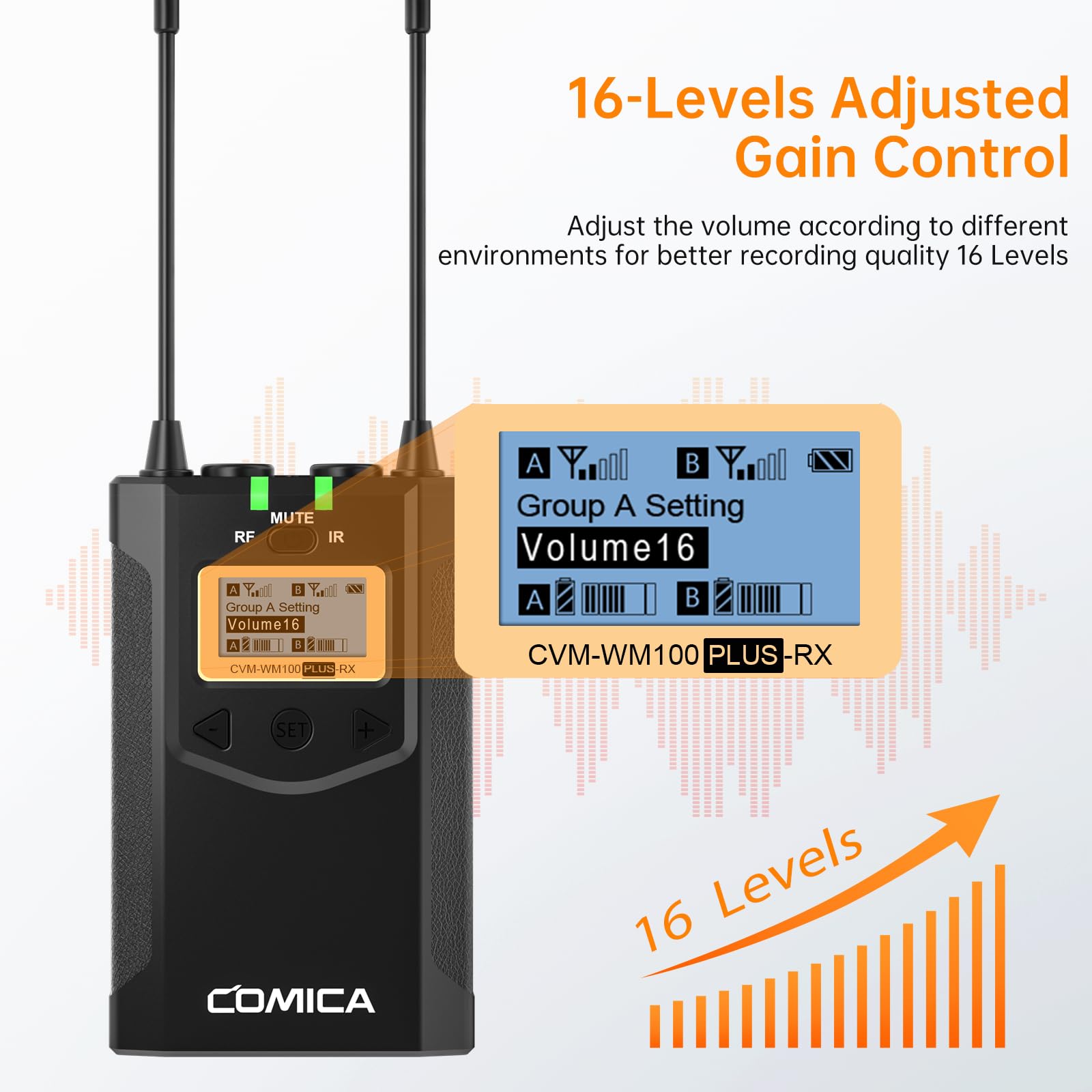 - 【Dual-Channel System & Mono/Stereo Mode】Comica CVM-WM100PLUS wireless microphone with dual transmitters and one receiver, and it can support mono/stereo output, which is easy for post-processing of audio, perfect for interviewing, recording, vlogging, and live-streaming.