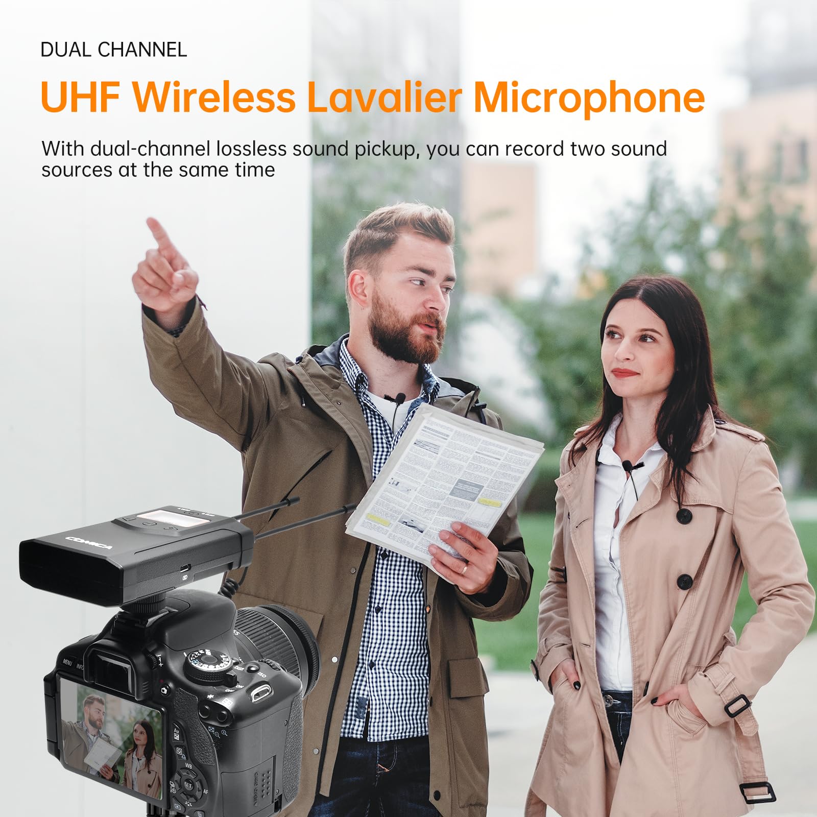 Comica CVM-WM100PLUS - Wireless Microphone System for Cameras, Camcorders, Smartphones, Laptops, Professional UHF Wireless Lavalier Lapel Microphone with Dual-Channel Recording, AA Batteries