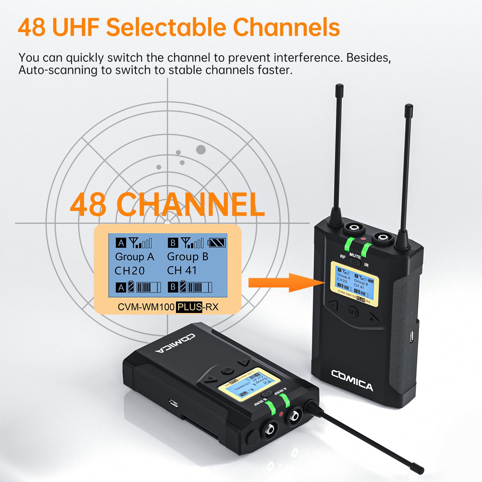 - 【48 UHF Selectable Channels】CVM-WM100PLUS wireless lavalier microphone comes with 48 channels to switch. When other channels are disturbed in the same space or near distance, you can quickly switch the channel to prevent interference. Besides, Auto-scanning to switch to stable channels faster.