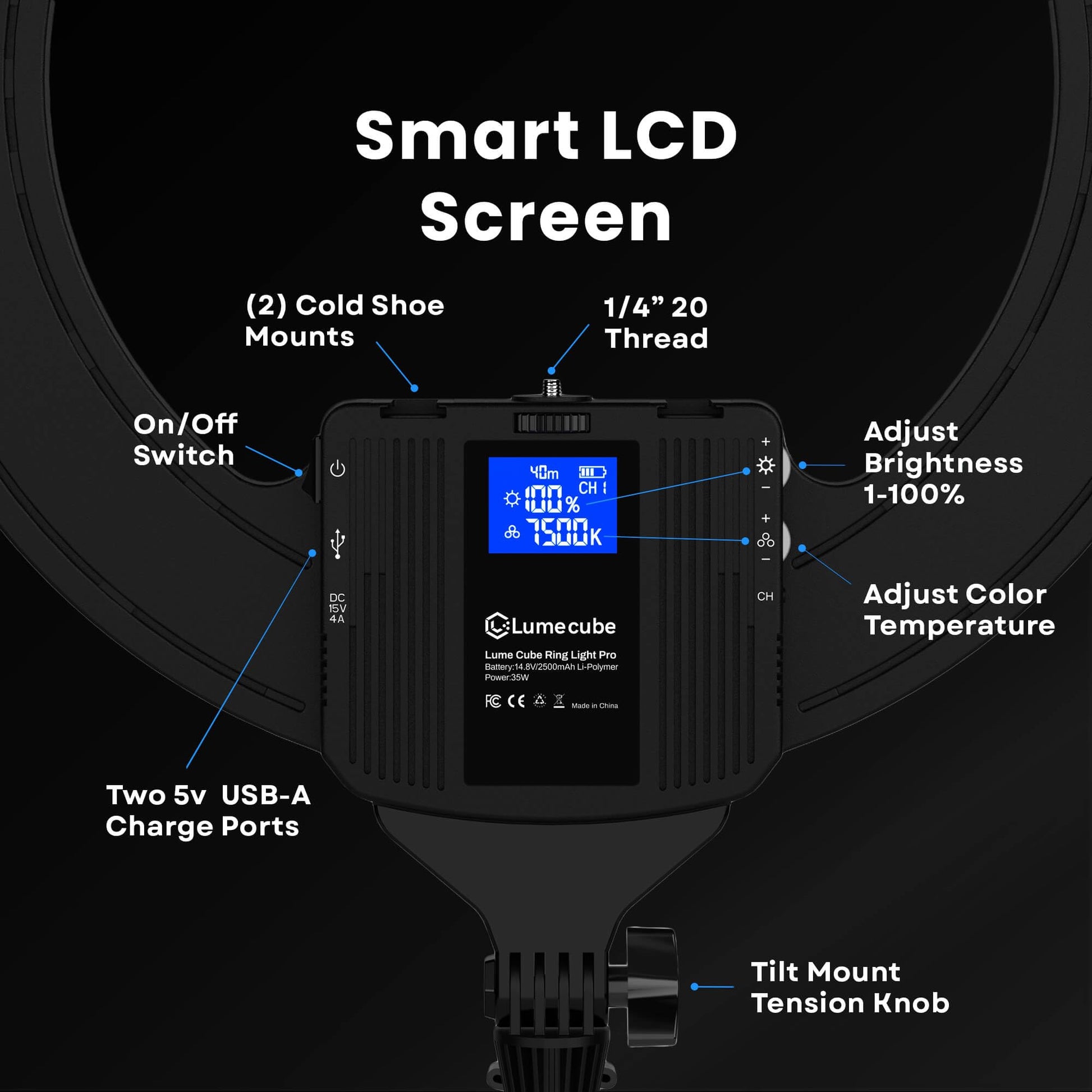 - Internal Rechargeable Battery - The Lume Cube Ring Light Pro is the only complete Edge Lit Studio-Grade ring light that features both an internal rechargeable battery and a power cord option. Free yourself to move from location to location with ease. Create content outdoors with no need for a plug. battery runs for 70 mins at full brightness, 2 hours at lower power.