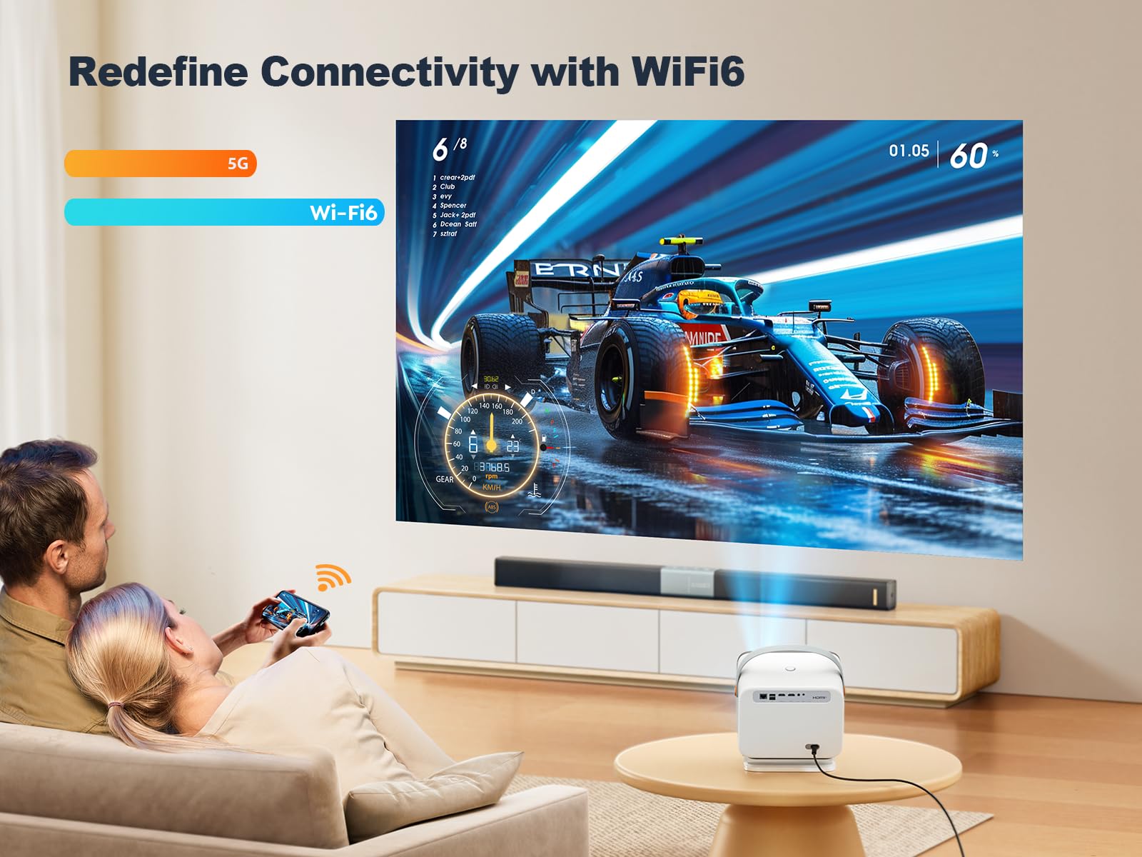 - 【WiFi6 | Bluetooth 5.2 | Lifetime Support】Speed Up! With WiFi 6, experience blazing-fast speeds that rival the efficiency of 5G, ensuring seamless mirroring from your phone. Meanwhile, the Two-way Bluetooth 5.2 opens up a world of possibilities, allowing you to transform the projector into a versatile Bluetooth speaker system.