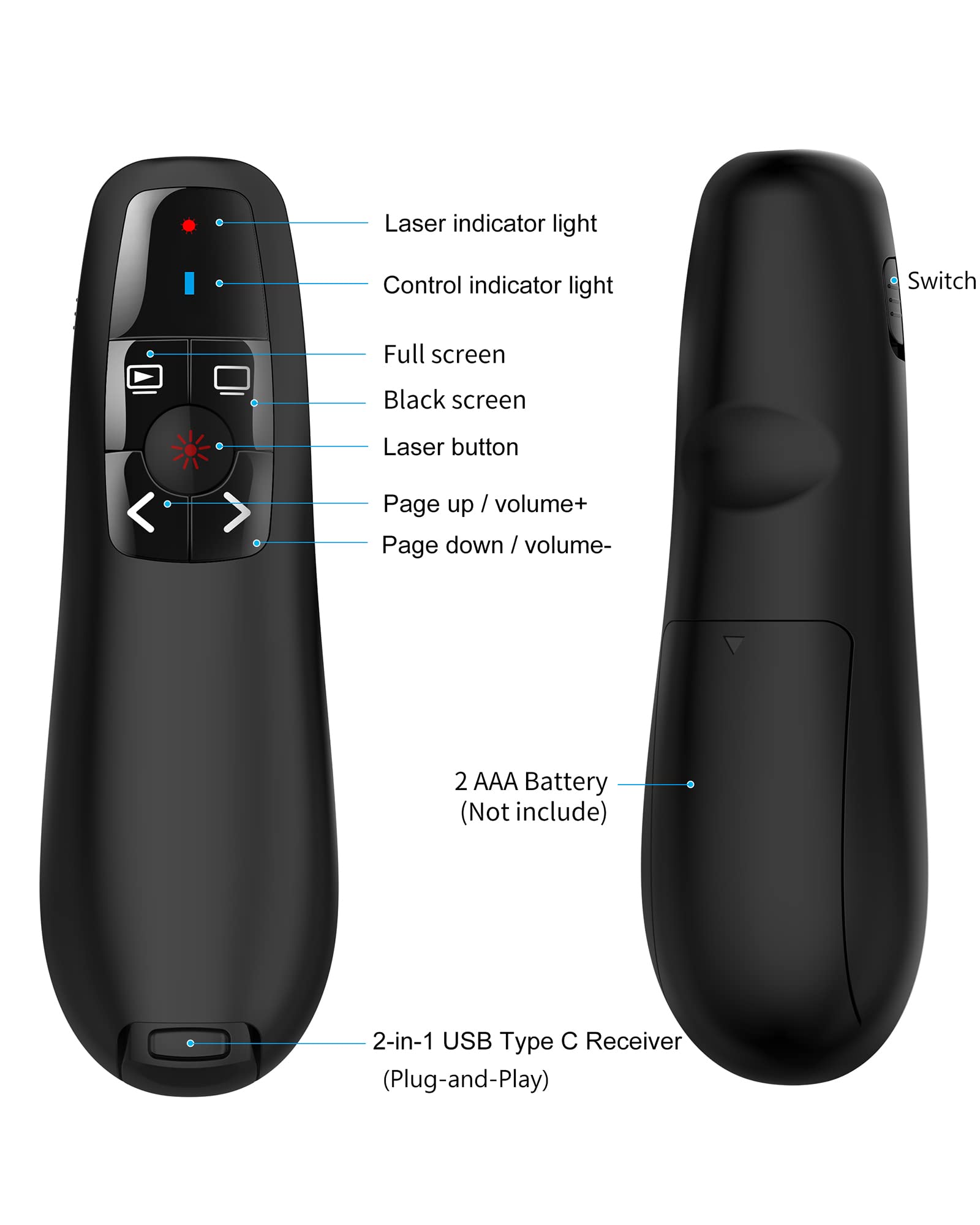 - Quick & Easy Set Up: Our presentation clicker runs on 2 AAA batteries (not included). The 2-in-1 USB Type C receiver plug-and-play, saves you from the trouble of downloading and installing any software or program.
