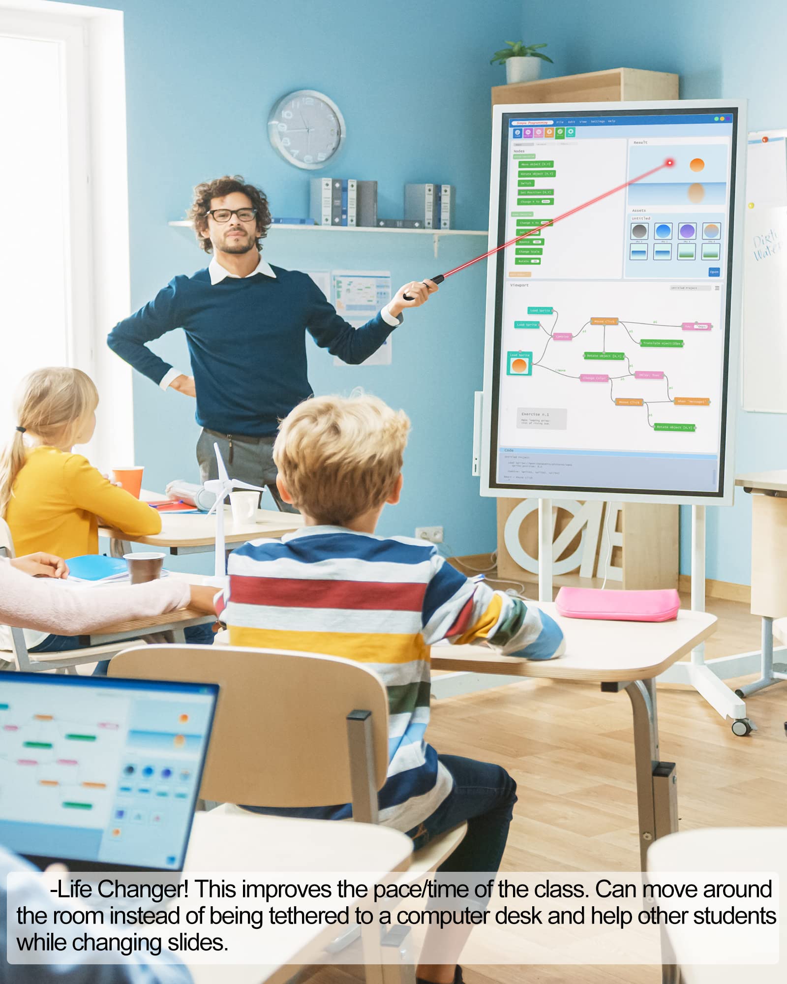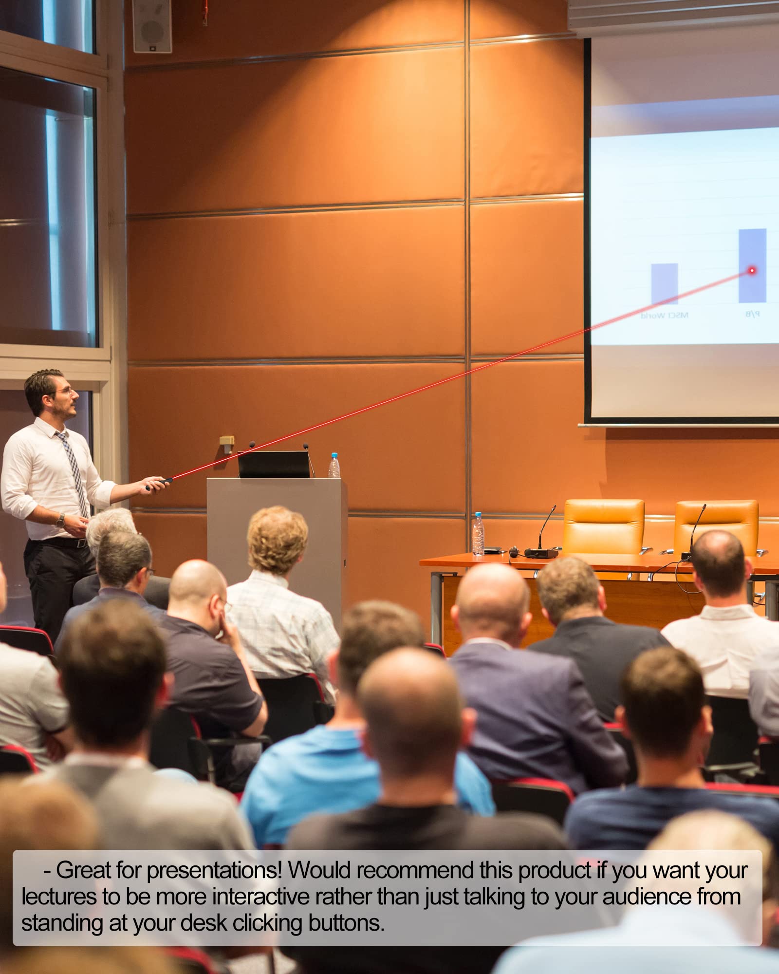 - Don't Be Tied to Your Computer: This presentation clicker lets you control your slides from a distance of up to 100 ft. Feel free to roam around the office, classroom, conference rooms, halls or auditorium while giving a presentation or lecture!