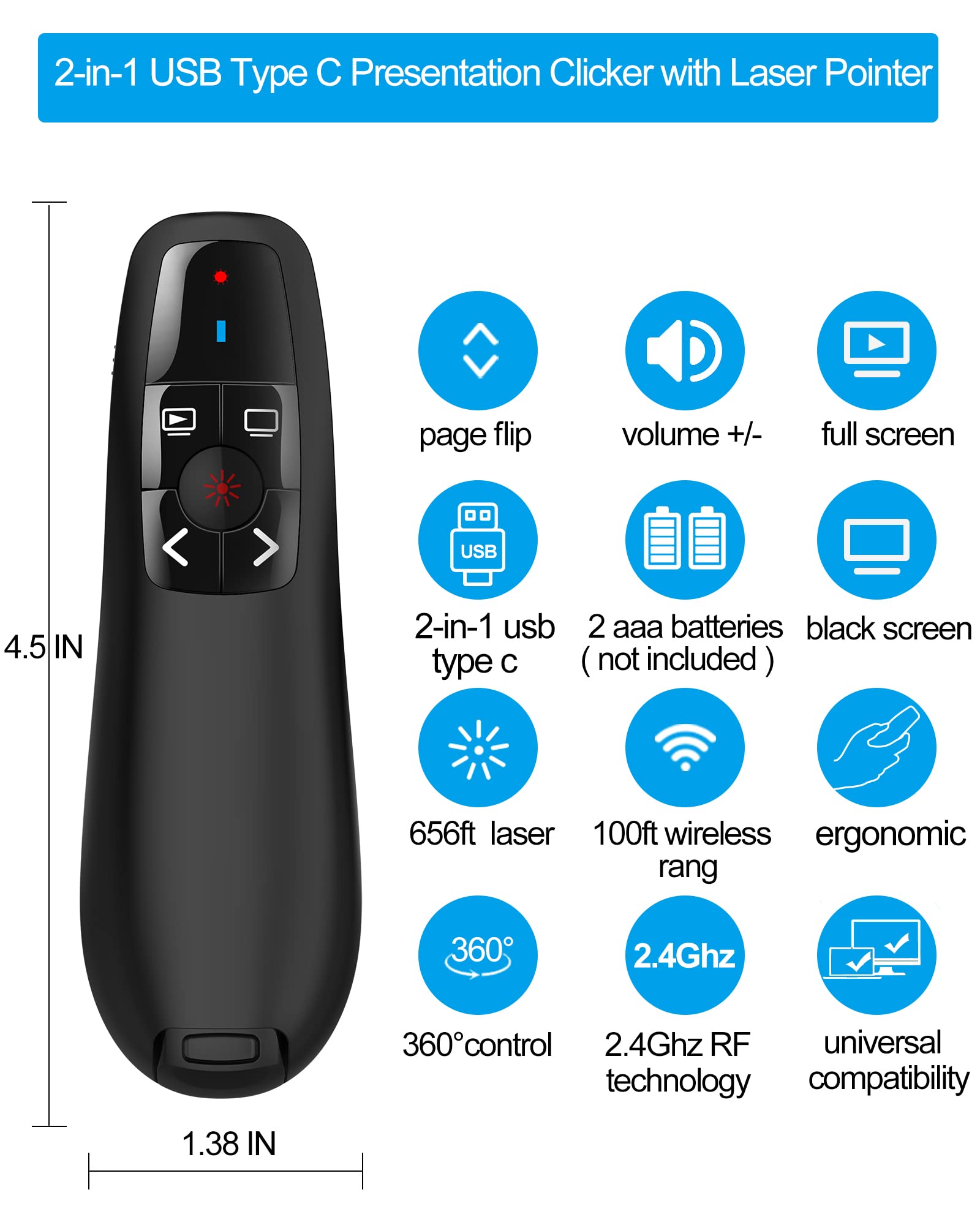 - 2-in-1 USB Type C Presentation Clicker: Aside from a 656ft long range red light pointer, the presentation clicker is also programmed with controls including volume control, page up, page down and full-screen.There's also a button for blacking out the screen